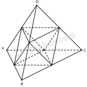 Cho tứ diện đều \(ABCD\). Gọi \((H)\) là hình bát diện đều có các đỉnh là trung điểm các cạnh của tứ diện đều đó. Tính tỉ số \(\dfrac{{{V_{(H)}}}}{{{V_{ABCD}}}}\).