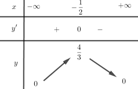 Từ bảng biến thiên ta thấy, hàm số đạt GTLN \(\mathop {\max }\limits_{\left( { – \infty ; + \infty } \right)} y = \dfrac{4}{3}\) khi \(x =  – \dfrac{1}{2}\).