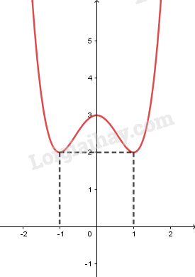 Điểm cực đại \(\left( {0;3} \right)\) và điểm cực tiểu \(\left( { – 1;2} \right),\left( {1;2} \right)\).