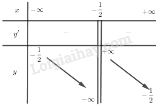 Hàm số nghịch biến trên mỗi khoảng \(\left( { – \infty ; – \frac{1}{2}} \right)\) và \(\left( { – \frac{1}{2}; + \infty } \right)\).