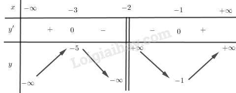 Hàm số nghịch biến trên mỗi khoảng \(\left( { – 3; – 2} \right)\) và \(\left( { – 2; – 1} \right)\).