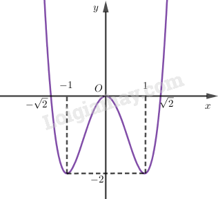 Đồ thị cắt trục hoành tại: \(A( – \sqrt 2 ;0),O(0;0),B(\sqrt 2 ;0)\).