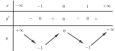 Có \(y’ = 4{x^3} – 4x = 4x({x^2} – 1)\); \(y’ = 0 \Leftrightarrow \left[ \begin{array}{l}x =  – 1\\x = 0\\x = 1\end{array} \right.\)