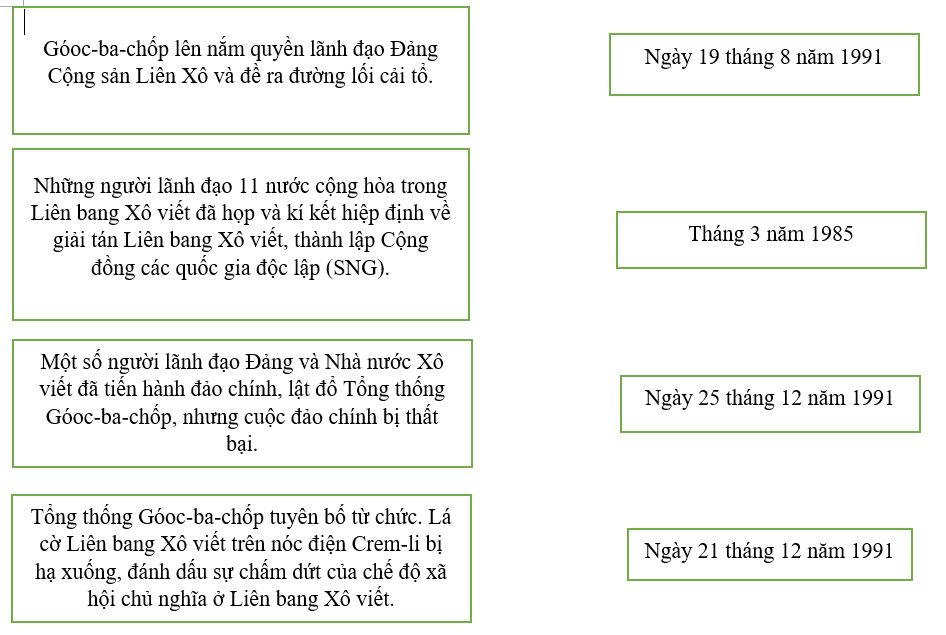 Hãy nối những sự kiện trong khung màu xanh với thời gian trong khung màu đỏ cho phù hợp để thấy được công cuộc cải tổ ở Liên Xô diễn ra như thế nào?