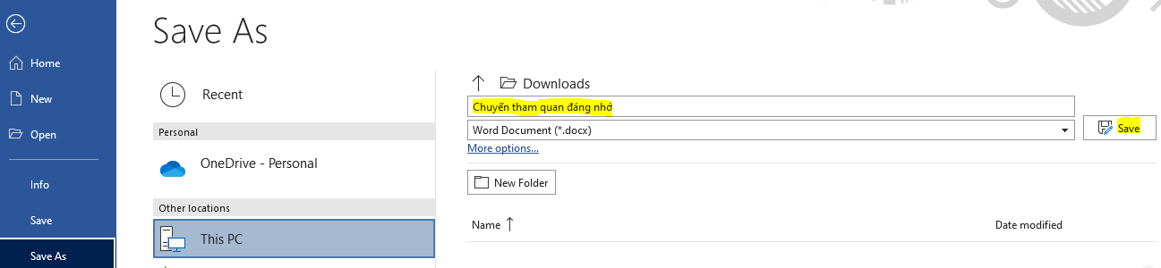 File => Save As => Điền tên tệp và chọn nơi muốn lưu tệp => Save.