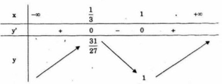 Hàm số đồng biến trên mỗi khoảng \(\left( { – \infty ;{1 \over 3}} \right)\) và \(\,\left( {1; + \infty } \right)\) , nghịch biến trên khoảng \(\,\left( {{1 \over 3};1} \right)\).