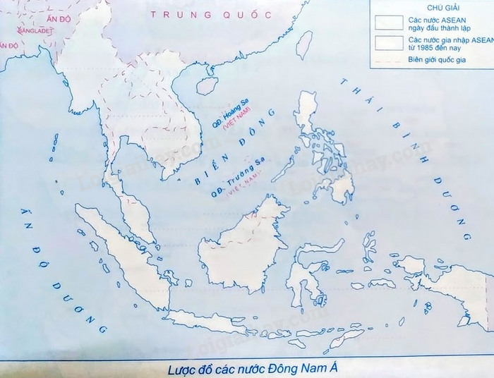– Tô màu vàng vào lãnh thổ các nước thuộc ASEAN từ ngày đầu thành lập; màu hồng vào lãnh thổ các nước gia nhập ASEAN từ năm 1985 đến nay.