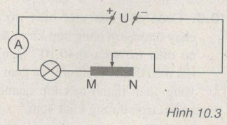 Hiệu điện thế U trong mạch điện có sơ đồ như hình 10.3 được giữ không đổi. Khi dịch chuyển con chạy của biến trở tiến dần về phía đầu N thì chỉ số ampe kế sẽ thay đổi như thế nào?