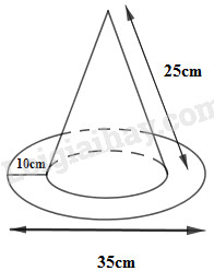 Ta có đường sinh \(l = 25cm;\) bán  kính đường tròn lớn là \({R_1} = 17,5cm;\) bán kính đường tròn nhỏ là \({R_2} = {R_1} – 10 = 7,5\left( {cm} \right);\pi  = 3,14.\).