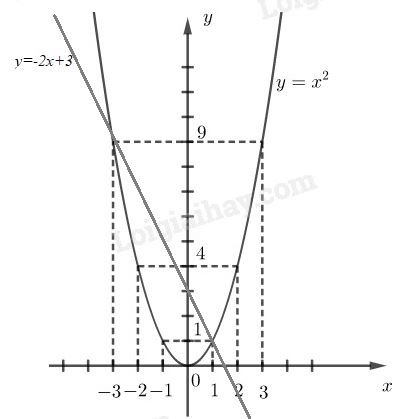 Vẽ đồ thị của hàm số \(y =  – 2x + 3\) và của hàm số \(y = a{x^2}\) với giá trị của \(a\) vừa tìm được trong câu \(a\) trên cùng một mặt phẳng tọa độ.