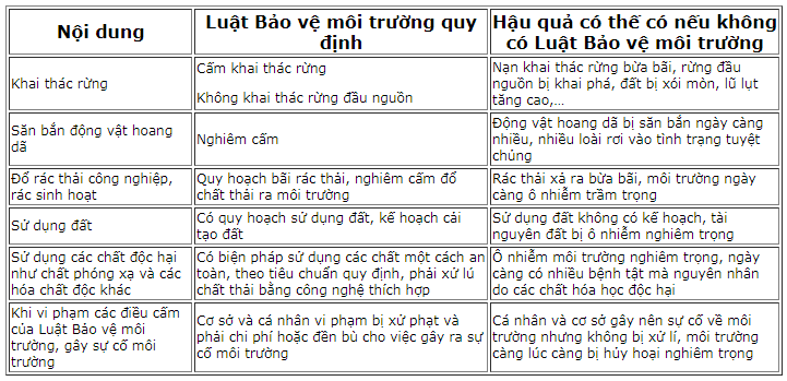 Bảng 61. Các ví dụ về thực hiện Luật Bảo vệ môi trường