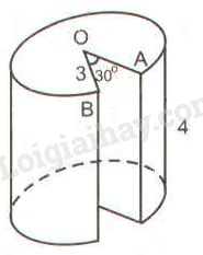 Một hình trụ có bán kính đường tròn đáy \(3cm\), chiều cao \(4cm\) được đặt đứng trên mặt bàn. Một phần của hình trụ bị cắt rời ra theo các bán kính \(OA,\) \(OB\) và theo chiều thẳng đứng từ trên xuống dưới với (xem hình 92).