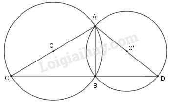 Giải bài 12 trang 95 VBT toán 9 tập 2. Cho hai đường tròn (O) và (O’) cắt nhau tại A và B. Vẽ các đường kính AC và AD của hai đường tròn. Chứng minh rằng ba điểm C, B, D thẳng hàng…