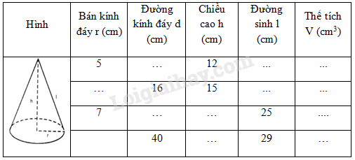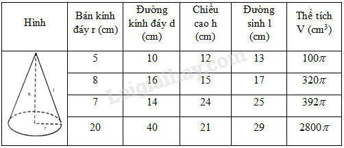– Thể tích  \(V = \dfrac{1}{3}\pi {r^2}h = \dfrac{1}{3}\pi {.7^2}.24 = 392\pi\)\( \left( {c{m^3}} \right)\)