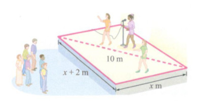 Một sân khấu hình chữ nhật có các kích thước như hình dưới. Hãy tìm chiều dài, chiều rộng của sân khấu.