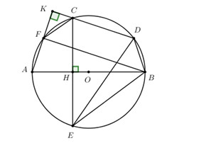 Cho đường tròn tâm O đường kính AB. Trên nửa đường tròn lấy hai điểm C, D. Vẽ dây cung CE vuông góc với AB tại H,vẽ AK vuông góc với CD tại K và cắt đường tròn tại F.