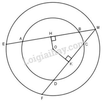 Cho hình \(70\) trong đó hai đường tròn cùng có tâm là \(O\). Cho biết \(AB>CD\).