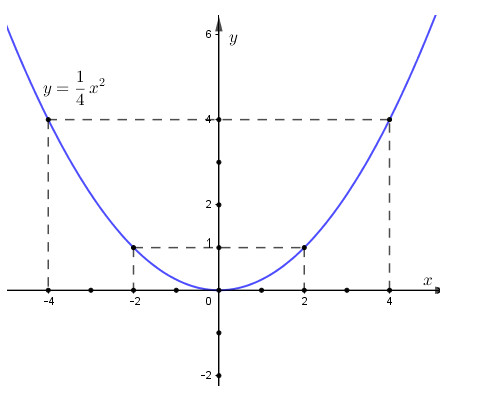 Vậy đồ thị hàm số \(y = \dfrac{1}{4}{x^2}\) là parabol đi qua các điểm có tọa độ là:\(\left( {-4;4} \right);\left({-2;1} \right);\left({0;0}\right);\left({2;1}\right);\left({4;4}\right)\)