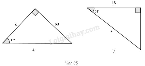 Tìm x trong mỗi hình sau (làm tròn đến chữ thập phân thứ ba), biết rằng \(\tan {47^0} \approx 1,072;cos{38^0} \approx 0,788.\)