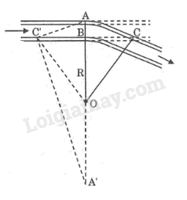 Để giúp xe lửa chuyển từ một đường ray từ hướng này sang một đường ray theo hướng khác, người ta làm xen giữa một đoạn đường ray hình vòng cung (hình \(1\)). Biết chiều rộng của đường ray là \(AB \approx 1,1m\), đoạn \(BC \approx 28,4m\). Hãy tính bán kính \(OA = R\) của đoạn đường ray hình vòng cung.