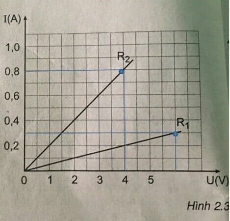 Trên hình 2.3 có vẽ đồ thị biểu diễn sự phụ thuộc của cường độ dòng điện vào hiệu điện thế đối với hai điện trở R1 và R2.