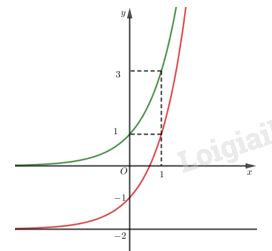 Đồ thị của hàm số y \(y = {3^x} – 2\)  nhận được từ đồ thị của hàm số \(y = {3^x}\) bằng phép tịnh tiến song song với trục tung xuống dưới \(2\) đơn vị (phần đồ thị màu đỏ).