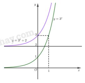 Đồ thị của hàm số \(y = {3^x} + 2\) nhận được từ đồ thị của hàm số \(y = {3^x}\) bằng phép tịnh tiến song song với trục tung lên phía trên \(2\) đơn vị (phần đồ thị màu tím).