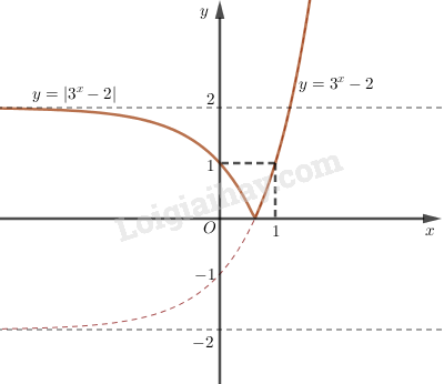 \(y = \left| {{3^x} – 2} \right| = \left\{ {\begin{array}{*{20}{c}}{{3^x} – 2,khi\,\,{3^x} – 2 \ge 0}\\{ – {3^x} + 2,khi\,\,{3^x} – 2 < 0}\end{array}} \right.\)