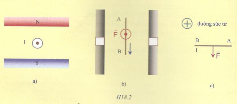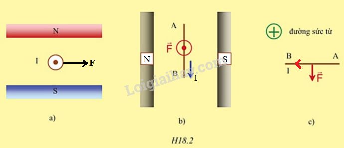 b) Lực điện từ tác dụng lên đoạn dây có phương vuông góc với mặt phẳng hình vẽ, có chiều hướng ra phía trước mặt phẳng hình vẽ được mô tả như ở hình H18.2b. Hãy xác định tên các cực từ của nam châm.