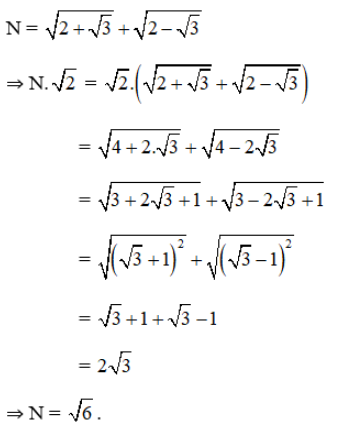 Vậy \(N = \sqrt {2 + \sqrt 3 }  + \sqrt {2 – \sqrt 3 }  = \sqrt 6. \)