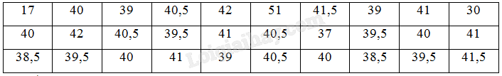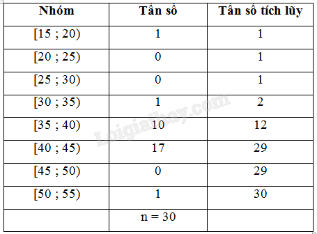 –  Trung bình cộng: \(\overline x  = \frac{{17,5.1+ 22,5.0 + 27,5.0 + 32,5.1 + 37,5.10 + 42,5.17 + 47,5.0 + 52,5.1}}{{30}} = 40\)