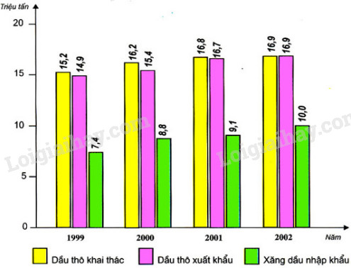 Hình 40.1. Biểu đồ sản lượng dầu thô khai thác, dầu thô xuất khẩu và xăng dầu nhập khẩu của nước ta, giai đoạn 1999 -2002.