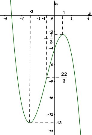 Hàm số \(y =  – {1 \over 3}{x^3} – {x^2} + 3x – 4\) đồng biến trên khoảng \((-3; 1)\) nên:
