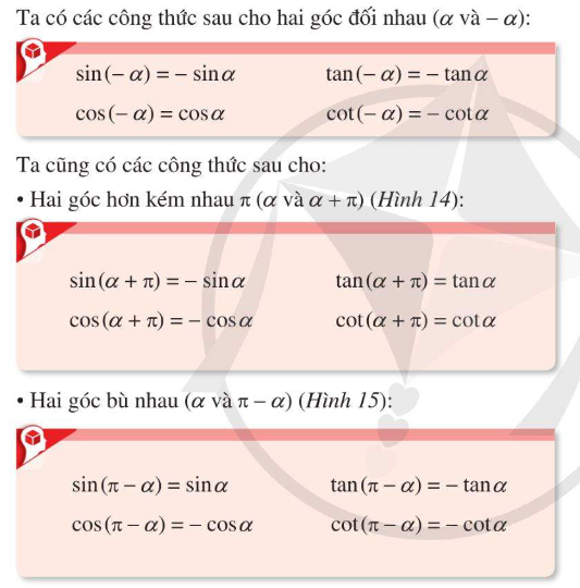 \(\begin{array}{l}\cos \left( { – \frac{{159\pi }}{4}} \right) = \cos \left( {\frac{{159\pi }}{4}} \right) = \cos \left( {40.\pi  – \frac{\pi }{4}} \right) = \cos \left( { – \frac{\pi }{4}} \right) = \cos \left( {\frac{\pi }{4}} \right) = \frac{{\sqrt 2 }}{2}\\\sin \left( { – \frac{{159\pi }}{4}} \right) =  – \sin \left( {\frac{{159\pi }}{4}} \right) =  – \sin \left( {40.\pi  – \frac{\pi }{4}} \right) =  – \sin \left( { – \frac{\pi }{4}} \right) = \sin \left( {\frac{\pi }{4}} \right) = \frac{{\sqrt 2 }}{2}\\\tan \left( { – \frac{{159\pi }}{4}} \right) = \frac{{\cos \left( { – \frac{{159\pi }}{4}} \right)}}{{\sin \left( { – \frac{{159\pi }}{4}} \right)}} = 1\\\cot \left( { – \frac{{159\pi }}{4}} \right) = \frac{1}{{\tan \left( { – \frac{{159\pi }}{4}} \right)}} = 1\end{array}\)