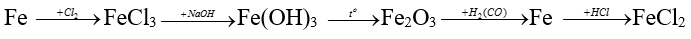 Có các chất sau: \(FeCl_3, Fe_2O_3, Fe, Fe(OH)_3, FeCl_2\). Hãy lập thành một dãy chuyển hóa và viết các phương trình hóa học. Ghi rõ điều kiện phản ứng.