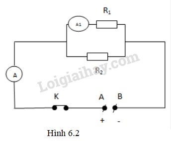Cho mạch điện có sơ đồ như hình 6.2, trong đó \(R_1= 10 Ω\), ampe kế \(A_1\) chỉ \(1,2 A\), ampe kế A chỉ \(1,8 A\)