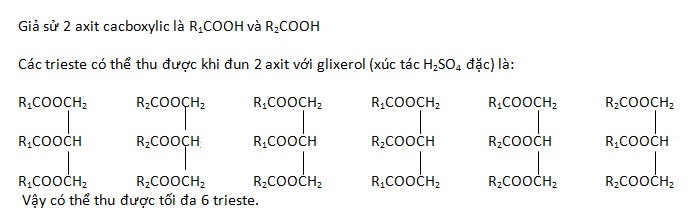 Khi đun hỗn hợp 2 axit cacboxylic với glixerol (axit H2SO4 làm xúc tác) có thể thu được mấy trieste ? Viết công thức cấu tạo của các chất này.