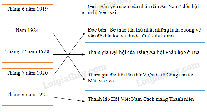 Dựa vào nội dung bài học, em hãy nối mỗi thời gian trong khung màu đỏ với cột sự kiện trong khung màu xanh cho đúng để thấy rõ những hoạt động chính của lãnh tụ Nguyễn Ái Quốc ở nước ngoài trong thời gian từ 1919 đến năm 1925.