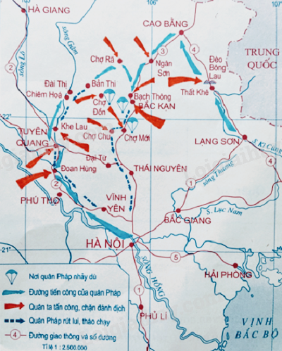 a) Hoàn thiện bảng chú giải bằng việc tô màu các kí hiệu: chiếc dù thể hiện nơi quân Pháp nhày dù; mũi tên thể hiện hướng tiến công của quân Pháp; mũi tên thể hiện hướng qân ta tấn công, chặn đánh địch; mũi tên thể hiện hướng quân Pháp rút lui, tháo chạy (lưu ý chọn màu đỏ cho quân ta, màu xanh cho quân địch)