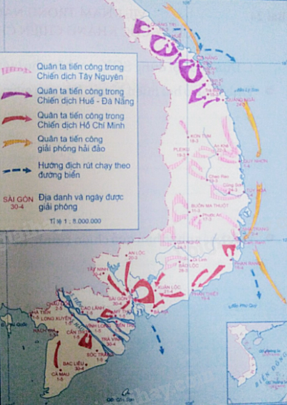 a) Tô màu (hồng nhạt, hồng đậm, đỏ, vàng cam) lần lượt vào kí hiệu chỉ hướng tấn công của quân ta trong chiến dịch Tây Nguyên, Huế – Đà Nẵng, thành phố Hồ Chí Minh và giải phóng hải đảo ở lược đồ bên (lưu ý hoàn thành bảng chú giải).