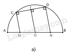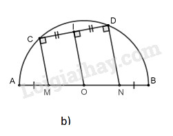 a)   Cho nửa đường tròn tâm \(O\), đường kính \(AB\), dây \(CD\). Các đường vuông góc với \(CD\) tại \(C\) và \(D\) tương ứng cắt \(AB\) ở \(M\) và \(N\). Chứng minh rằng \(AM = BN.\)