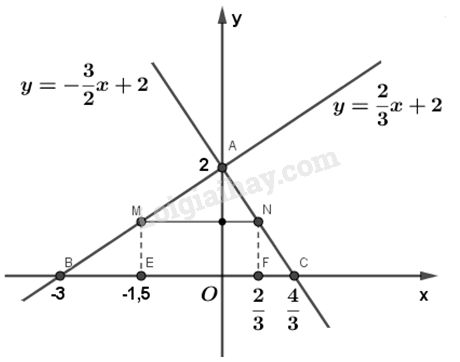 b) Một đường thẳng song song với trục hoành Ox, cắt trục tung Oy tại điểm có tung độ bằng 1, cắt các đường thẳng \(y = \dfrac{2}{3}x + 2\) và \(y =  – \dfrac{3}{2}x + 2\) theo thứ tự tại hai điểm M và N. Tìm tọa độ của hai điểm M và N.