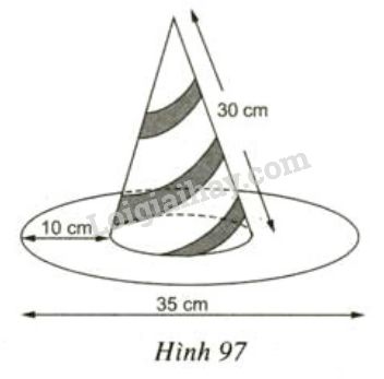 Cái mũ của chú hề với các kích thước cho theo hình vẽ (h97). Hãy tính tổng diện tích vải vẩn có để làm nên cái mũ (Không kể riềm, mép, phần thừa).