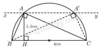 Vì \(xy\) cách \(BC\) một khoảng \(1,5m < \displaystyle {{BC} \over 2} = 2cm\) nên đường thẳng \(xy\) cắt nửa đường tròn đường kính \(BC.\)