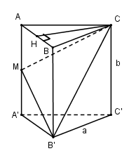 Thể tích khối chóp \(C.ABB’M\) là: \({V_{C.ABB’M}} = {1 \over 3}{S_{ABB’M}}.CH \) \(= {1 \over 3}{{3ab} \over 4}.{{a\sqrt 3 } \over 2} = {{{a^2}b\sqrt 3 } \over 8}\)