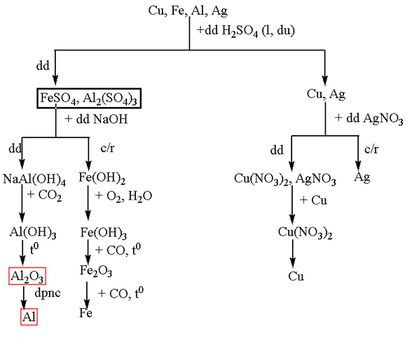 Trình bày sơ đồ tách riêng từng kim loại từ hỗn hợp các kim loại : Cu, Fe, Al, Ag.