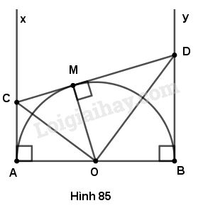 Cho nửa đường tròn tâm \(O\) có đường kính \(AB\) (đường kính của một đường tròn chia đường tròn đó thành hai nửa đường tròn). Gọi \(Ax,\ By\) là các tia vuông góc với \(AB\) (\(Ax,\ By\) và nửa đường tròn thuộc cùng một nửa mặt phẳng bờ \(AB\)). Qua điểm \(M\) thuộc nửa đường tròn (\(M\) khác \(A\) và \(B\)), kẻ tiếp tuyến với nửa đường tròn, nó cắt \(Ax\) và \(By\) theo thứ tự ở \(C\) và \(D\).
