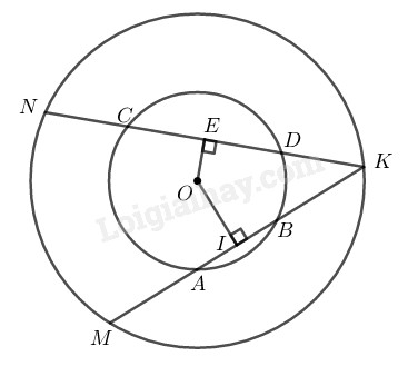 Cho đường tròn \((O),\) dây \(AB\) và dây \(CD,\) \(AB < CD.\) Giao điểm \(K\) của các đường thẳng \(AB,\) \(CD\) nằm ngoài đường tròn. Đường tròn \((O ; OK)\) cắt \(KA\) và \(KC\) tại \(M\) và \(N.\) Chứng minh rằng \(KM < KN.\)