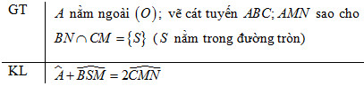 \(\widehat {BSM} = \dfrac{1}{2}\)(sđ\(\overparen{NC}+\) sđ\(\overparen{BM}\))    (2)
