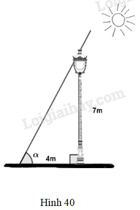 Một cột đèn cao 7m có bóng trên mặt đất dài 4m. hãy tính góc mà tia sáng mặt trời tạo với mặt đất (góc \(\alpha \) trong hình 40, làm tòn đến phút).